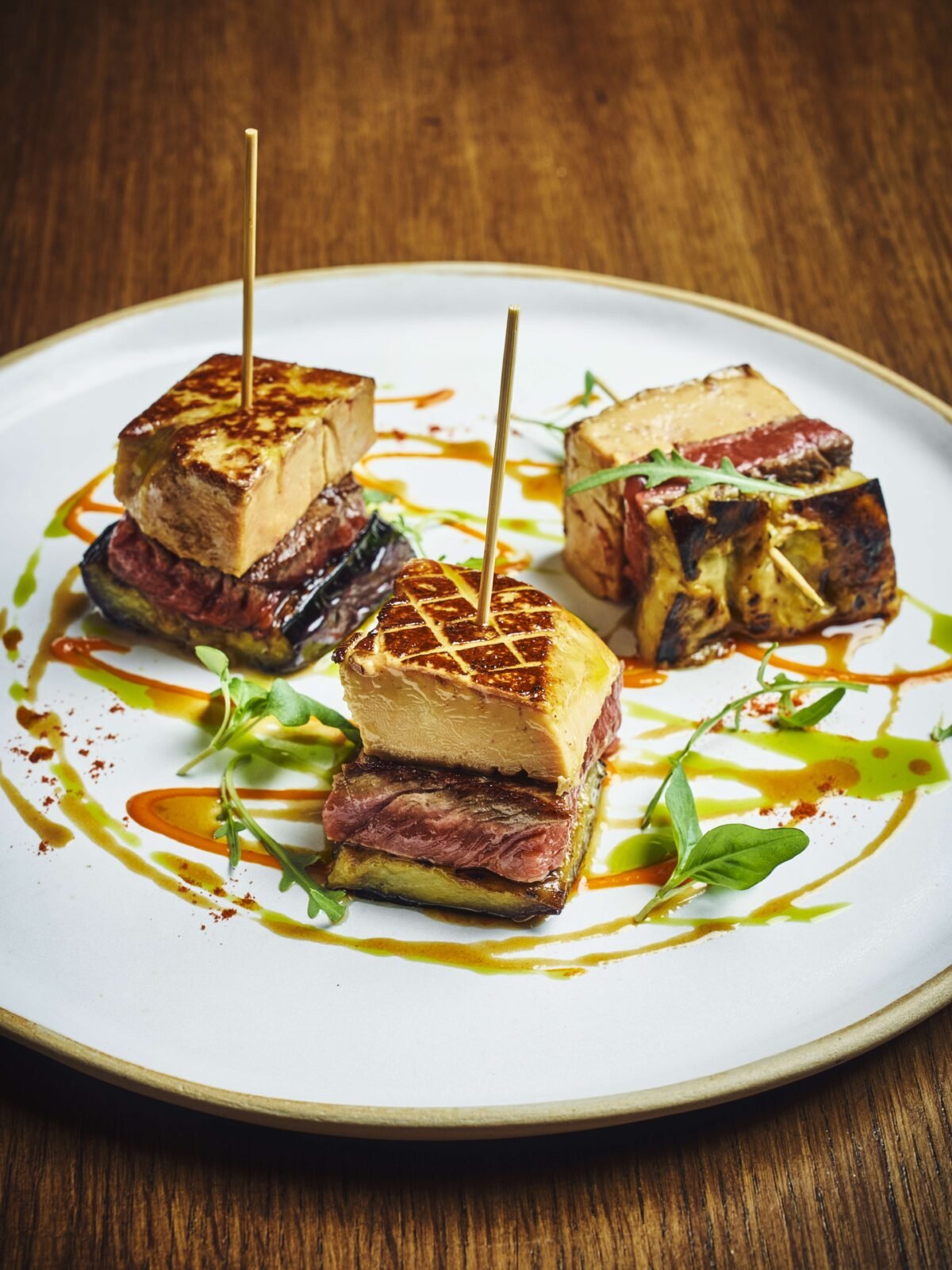 - Monter les pinchos en commençant par la tranche d’aubergine, puis le bœuf, puis le Foie Gras par-dessus.