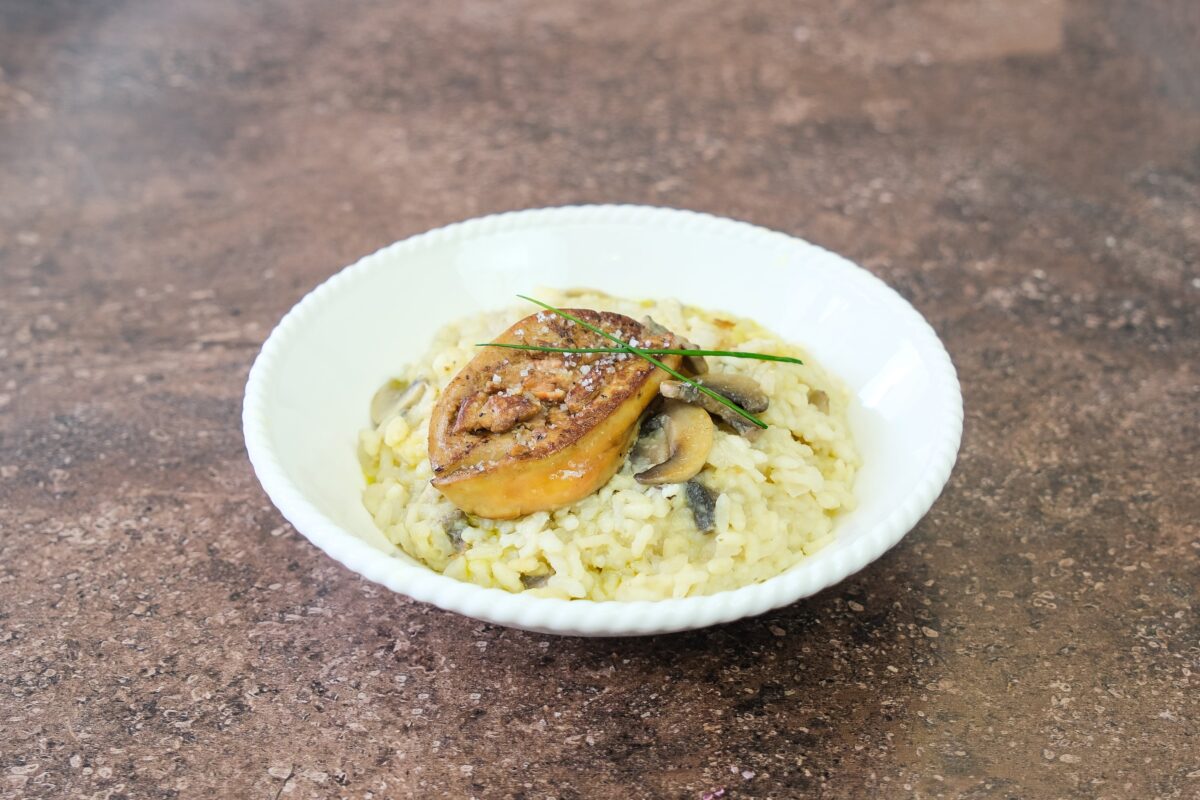 Hors du feu incorporez le parmesan râpé et mélangez délicatement pour obtenir une texture crémeuse et onctueuse. Déposez les escalopes de foie gras sur le dessus, salez, poivrez.